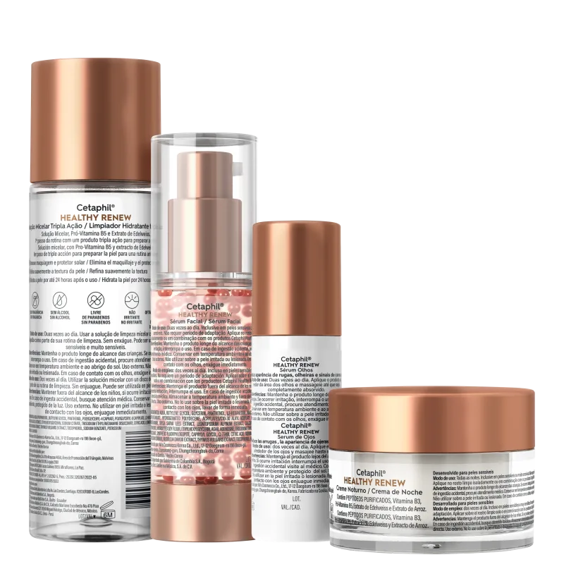 O Kit Cetaphil Healthy Renew traz água micelar, sérum facial, creme facial noturno e sérum para área dos olhos. Um cuidado completo para deixar a pele revitalizada e radiante. A fórmula ajuda a reduzir rugas e linhas finas, e melhora a luminosidade, a firmeza e a elasticidade da pele.